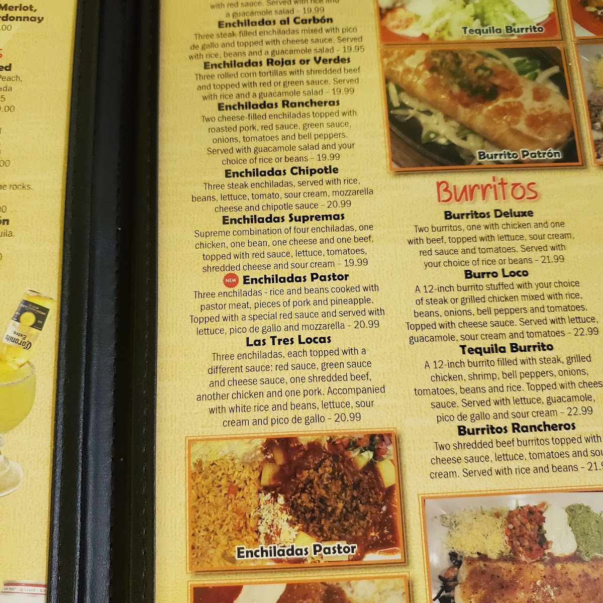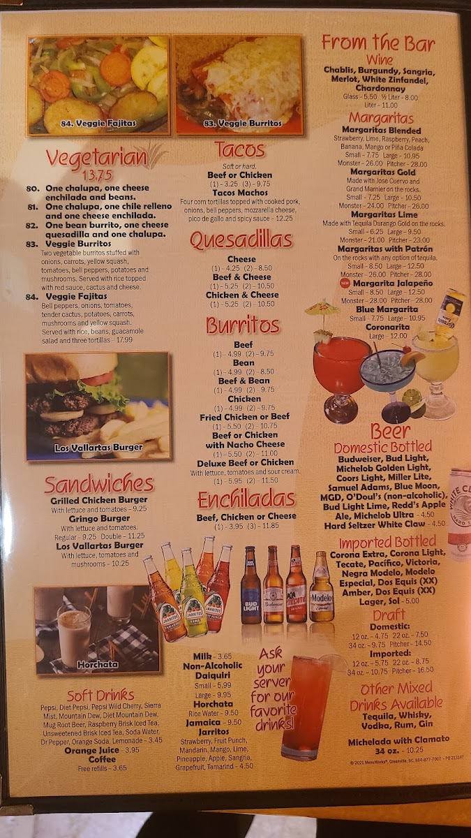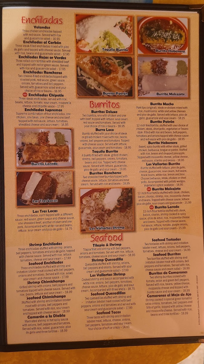 In addition to the main courses, the restaurant offers a variety of Burritos such as the Burro Loco, Burrito Habanero, and Vallarta's Burrito. There are also several Enchiladas to choose from, including the smoky Enchiladas Chipotle and the flavorful Enchiladas Pastor. For a warming dish, try one of the comforting Soups, like the Chicken Rice Soup or the zesty Tortilla Soup.