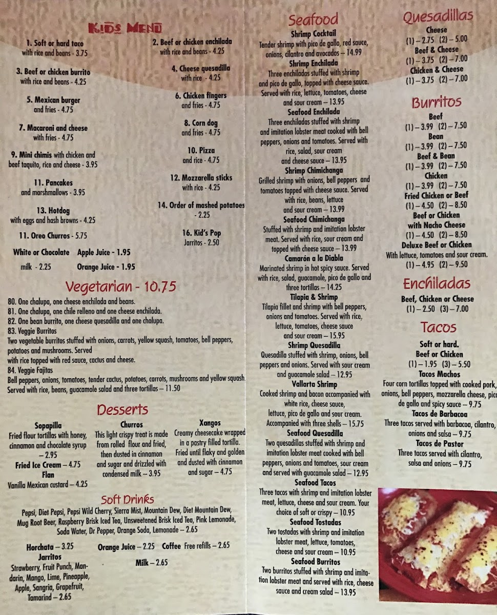 For those seeking lighter or fresher fare, there are Salads like the Fajita Taco Salad and Guacamole Salad. If seafood is what you're after, the Seafood Burritos, Shrimp Quesadilla, and Seafood Tacos will not disappoint.