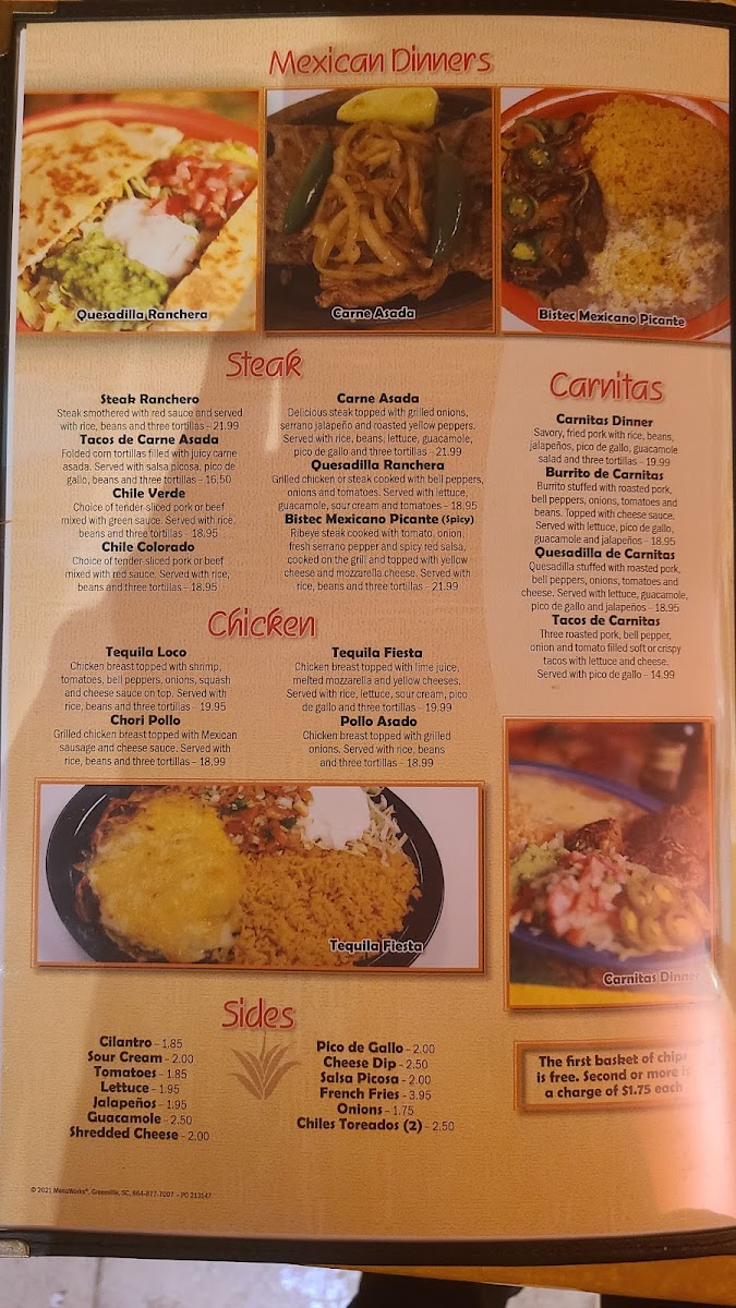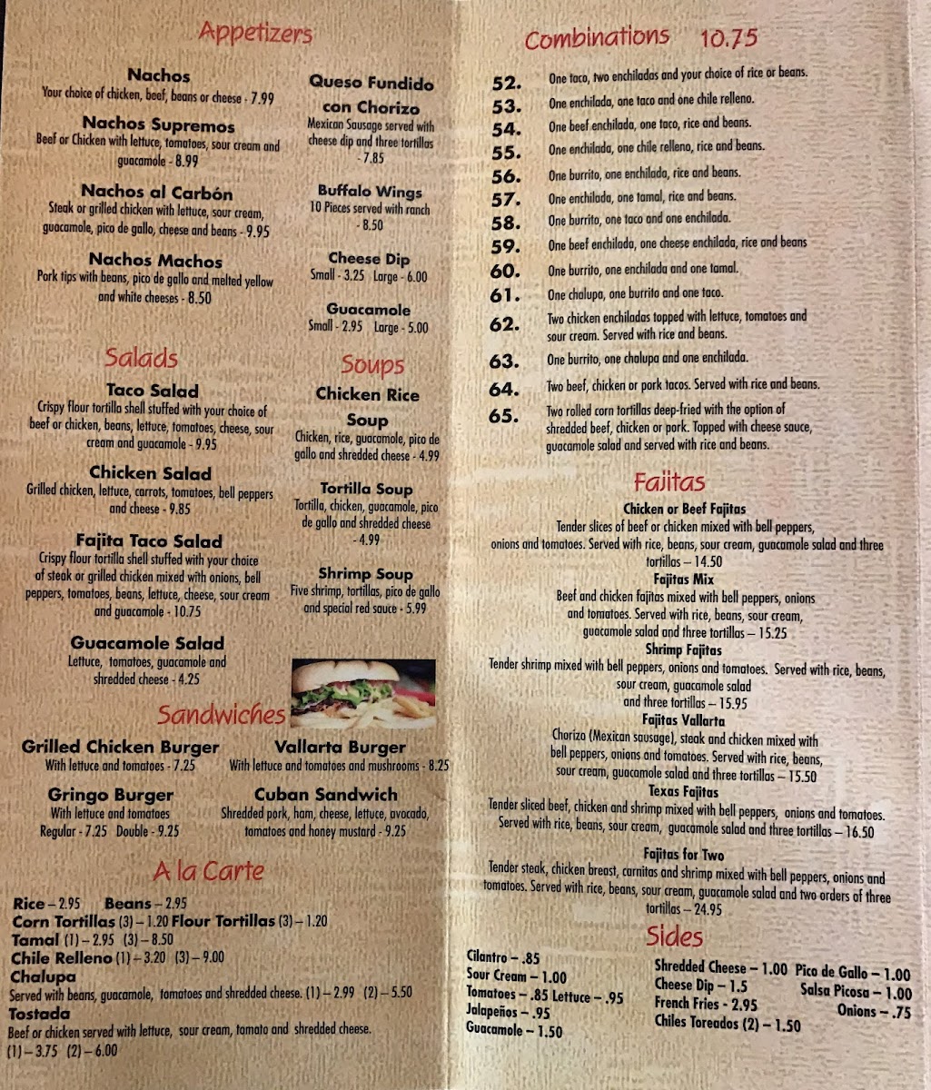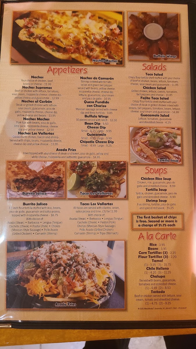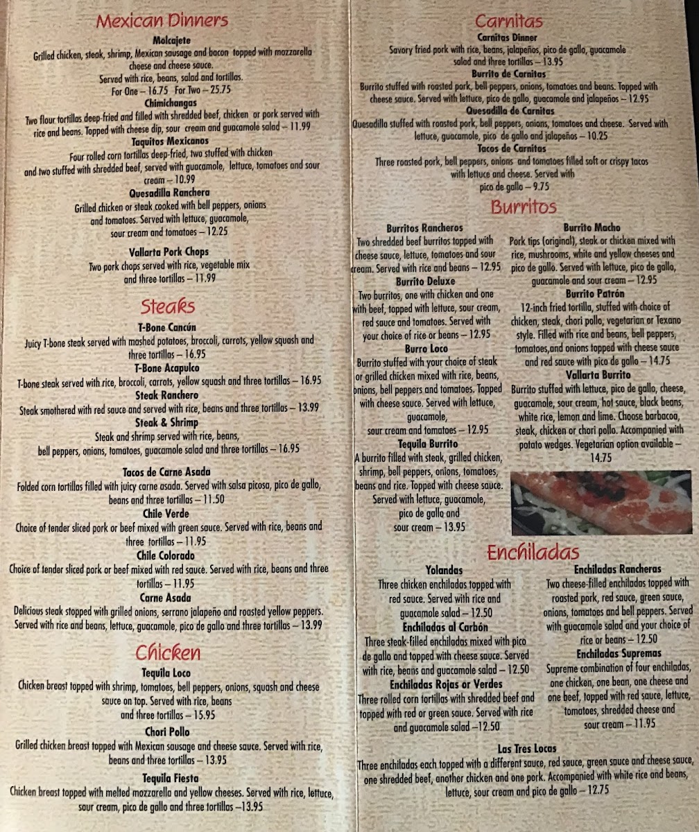 The menu at Vallarta's Mexican Grill offers a vibrant array of traditional and flavorful Mexican dishes that cater to various tastes. The Steak section features hearty options like the Steak Ranchero and Bistec Mexicano Picante for those craving a meaty feast, along with other delicious choices such as Quesadilla Ranchera and Tacos De Carne Asada. For sides, diners can indulge in the zesty Salsa Picosa, Chiles Toreados (2), or fiery Jalapeños to add a little extra spice to their meal.